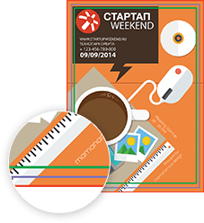 Если фон вашего дизайна доходит до краев листа, продлите его до края шаблона в зону вылетов. Если этого не сделать, при резке по краям получатся белые полосы.